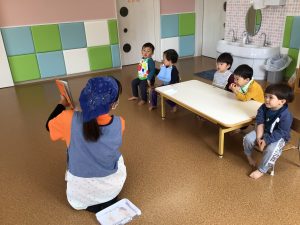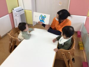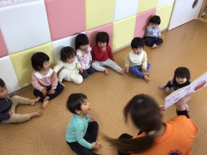絵本で繰り返し出てくる「おはよう」の言葉には、保育者の目を見つめるももぐみさんの姿もありました❣️「おはよう」の意味がわかり、ご挨拶が身についてきているのですね😊