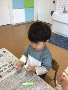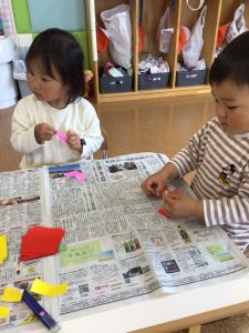 好きな色の折り紙を選んで自分たちでちぎってみました😄