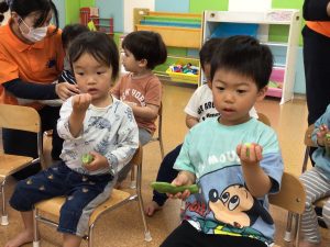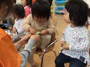「本物のそら豆だよ」とりんご組のお友だちがもも組さんに見せに来てくれていました😊