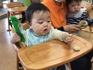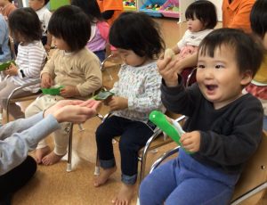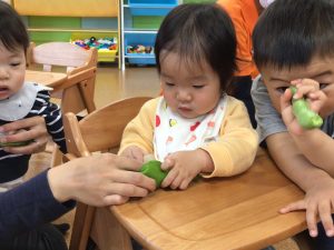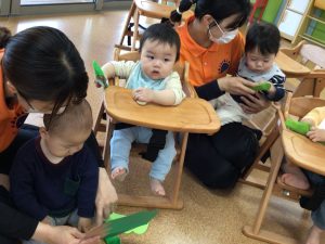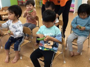 ももぐみさんも給食の先生お手製のフェルトのそら豆で収穫体験😆