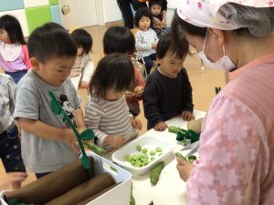 子どもたちの手のひらサイズもある大きなそら豆を不思議そうに観察したり、「大きい〜🎵」と嬉しそうな声も☺️