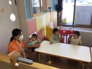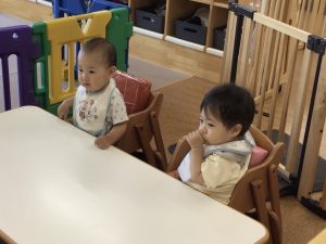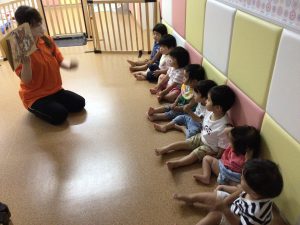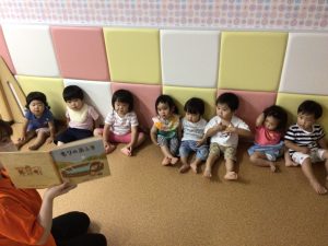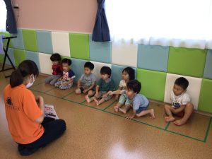 「わんわんもいたね」と声をかけるとイラストを指さしたり喃語を話したりして絵本に夢中になっていた子どもたちです😄