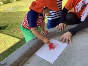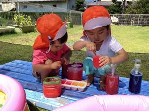 お水の色が赤や青、黄色に変化していき、みんな夢中で楽しんでいました😆「あーか‼️」「ジュース❤️」とカラフルで美味しそうな飲み物がたくさん並んでいましたよ🍹