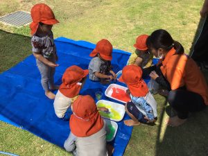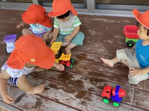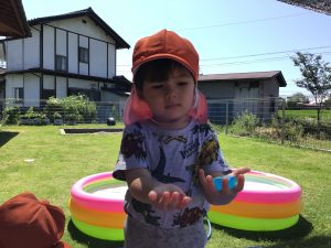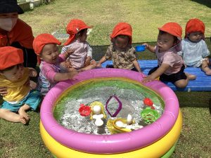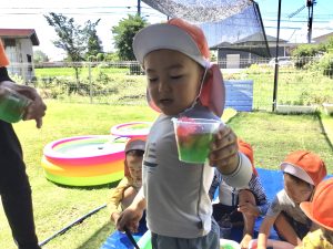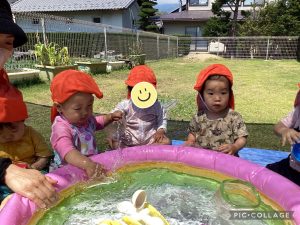 水遊びが始まってから1ヶ月がたち、水遊びにもだんだん慣れてきた様子も見られる子どもたち😁
