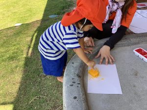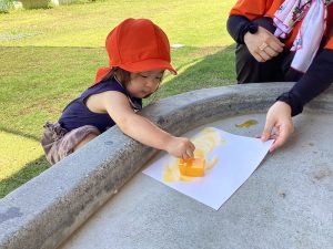 お絵描きが終わった後は色水遊び‼️色つきの氷をお水の中でくるくるすると、、、