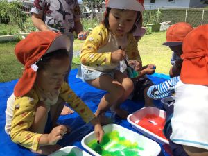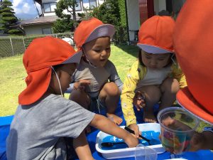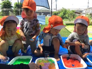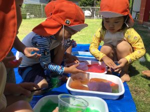 手で掴んで氷の冷たさやツルツルの感触を楽しんだりして水遊びができない日も夏ならではの遊びを体験しています😊