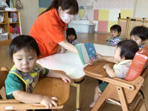 保育者に読んでもらうだけではなく子どもたちの手が届くところに絵本を用意しておくことで自分が好きな絵本、気になる絵本を自由に見ることを楽しめる環境も作っています📕