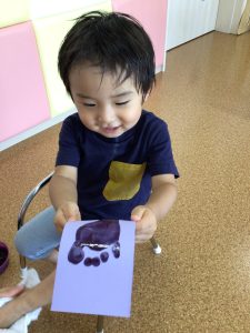 「ぺったん🌟」と言いながら足をそ〜っとついて取れた足型を見て、「できた♡」と嬉しそうなお友だちの表情です♩