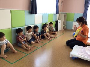 「赤ちゃんかわいいね〜!」の言葉には、保育者の顔を見て“にこ〜“と笑顔を見せているのでした💛