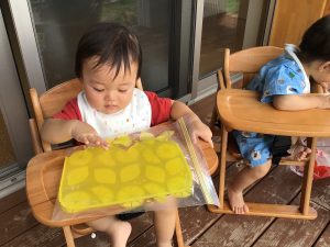 手の平や指先、足など、体のいろんなところを使って寒天の感触を面白がっていました☺️