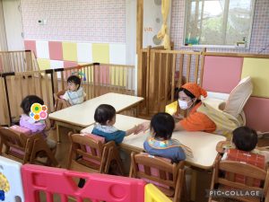 くっついた!と保育者が表情を明るくして読むと、その表情を真似っこして嬉しそうなお顔をしながら楽しんでみているもも組さん☺️