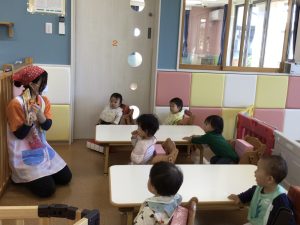 先生と一緒に「トリックオアトリート🎵」と合言葉を覚えて一緒に言っている姿もあり、ハロウィン会に向けての練習もバッチリです👌