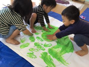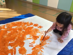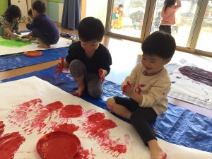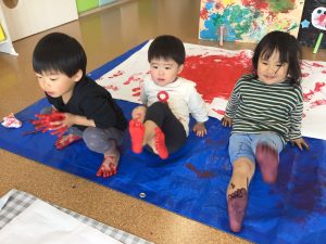 「見てー‼️絵の具でいっぱい〜‼️」と保育者に見せたり友だちに見せたりして完成した後も盛り上がっていたりんご組さんなのでした😊