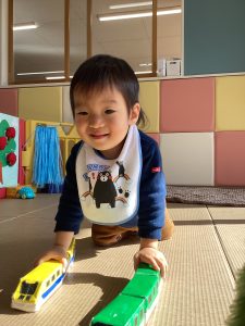 器用に両手で電車を持ちながら、体のバランスをとって上手に電車を走らせていてすごいですね🚃❤️