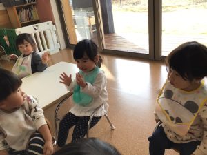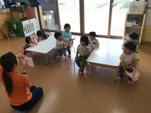 保育者の声に合わせて、いちご組のお友だちも元気に答えてくれていますよ😆