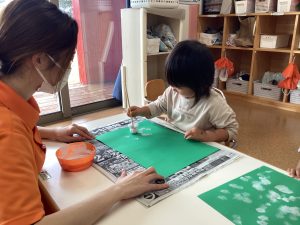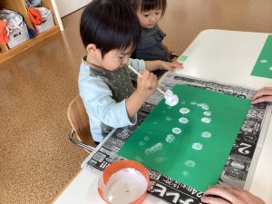 画用紙についていくたくさんの模様に「おもしろーい🎵」とタンポを動かす手が止まらない子どもたちでした😆