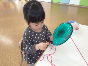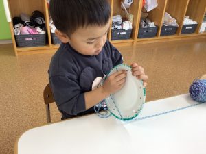 紙皿に開いた小さな穴に細い毛糸を入れていくのですが、「りんごさんできる?」の保育者の問いかけに「できるよ‼️」と即答で頼もしい言葉が😊