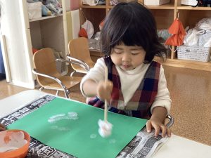 製作中は、保育者の真似をして「ポーン!ポンポン」とリズムよく口ずさみながら、力強いスタンプ🗯