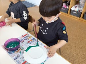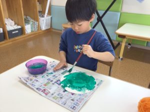 「ここだよね?」と自分からスイスイっと塗り始め、筆と絵の具を使った製作活動もお手のものです😁