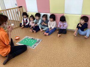 保育者が説明をして見本を見せる場面では、上手にスタンプができた先生に「すごーい✨」と子どもたちから自然と拍手が👏