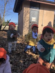 落ち葉の上を歩くと“カサっカサっ“と面白い音がなるので、子どもたちも歩く度に笑顔を浮かべたり「あー🎵」と声を出して喜んでいたり🤭