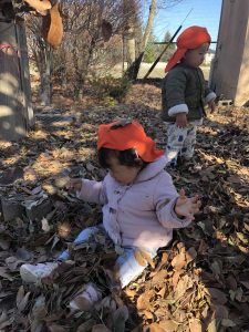 座って落ち葉の中に足を入れてみたりするお友だちも😌