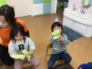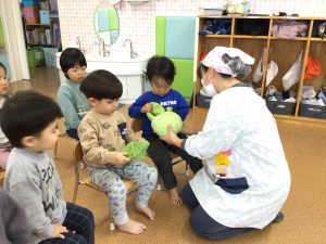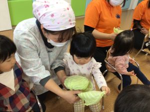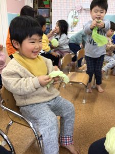 まずはみんなで『キャベツのなかから』という手遊びをしました🎵