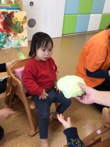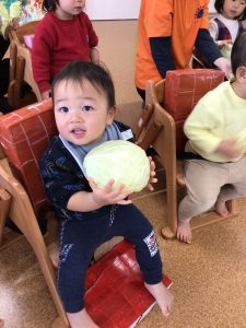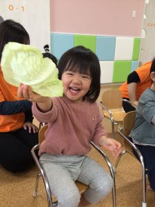 キャベツを半分に切って断面も見てみました!そっと触ってみたり匂いを嗅いでみたり・・「どんな匂いがする?」と質問されると「くちゃ〜い😆」と答える子もいましたよ☺️