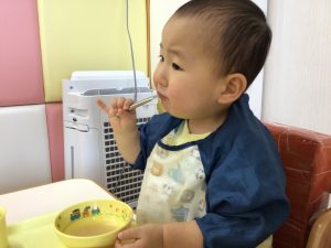 指先を使って少しずつちぎると「どうぞ🎵」と保育者に渡してくれました☺️