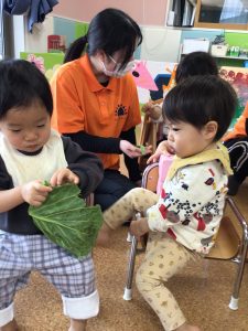 もも組のお友だちは、お兄さんお姉さんが剥いてくれた葉を触らせてもらいました。