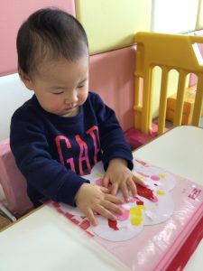 最初は手が汚れてしまうことに抵抗する子もいましたが、保育者の見本を見て少しずつ興味を持ち触ることができました🌟そして、自分の手のひらを見てみると“あれ!?絵の具が付いていない!”と不思議そうな表情をしていましたよ😊