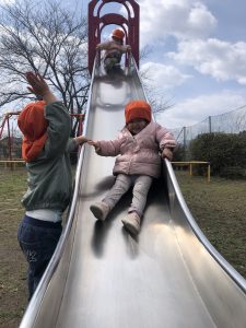 滑り台では踏切に見立てて「カンカンカン!」とお友だち同士でのやりとりを楽しんでいます❤️