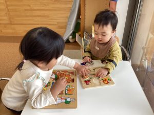 いちご組さんはパズルに夢中です🎵給食後のお着替えが終わると「パズルする!」と保育者に声を掛けています😊お友だちが“できない”と困っていると、お手伝いをしてあげる優しい姿も見られています✨全てはめることができた時には満面の笑みで「できた!」と教えてくれます😆