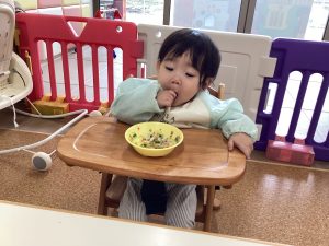たくさん遊んだ後には大好きな給食の時間😋手づかみ食べで進めることができています!「おいしいね☺️」と保育者に声を掛けてもらうと、にっこり笑顔も見せてくれますよ🎵