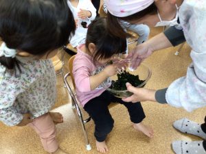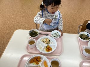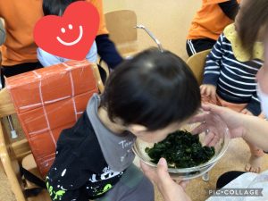 最後に「今日の給食のどこにわかめがあるか探してみてね!」と給食の先生からお話をしてもらうと、「おみそしるにあるんじゃない?」と予想するお友だちの姿がありました🎵