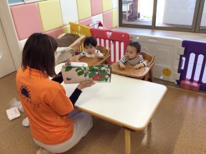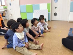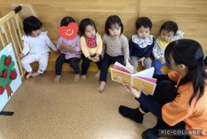 「ぽろりーん〇〇さん」と果物の絵が出てくると、指さしをしたり嬉しそうに、にこにこしたりするもも組のお友だち☺️
