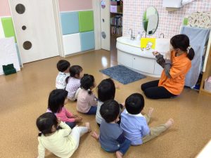 たくさん遊んで泥だらけになったノンタンとどうぶつさんたちがお風呂に入ることに☺️泡でゴシゴシすると、たくさんの泡ができましたよ🫧興味津々で見つめている子どもたち💓泡の中からしっぽやお耳、おててやおひげが見えました❣️「これはだーれ?」と聞いてみると「たぬきさん!」「うさぎさん!」「ノンタン!」と元気よく答えてくれました🌟