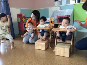 保育者がおやつを用意すると“早く食べたいなぁ”と体を弾ませてワクワクしているもも組さんです☺️