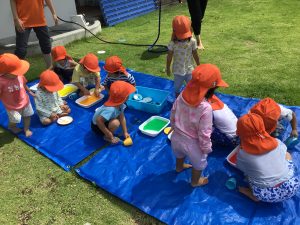 「冷たいね」「ツルツルしてるね」と保育者に声をかけてもらいながら様々な感触を楽しむことができましたよ❣️