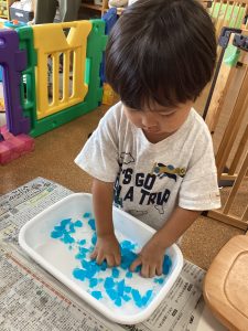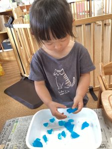 もも組さんは保育室で寒天遊びを楽しみました😊