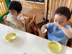 おやつや給食が出てくると、手を合わせて“いただきます”の挨拶を待っている可愛らしい姿が見られています💓