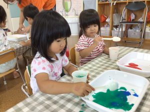 自分たちで好きな色の絵の具を選び、お水と混ぜることに挑戦🌟
