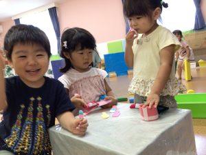 保育者が手作りしたお化粧道具を上手に使いこなしていますよ😊