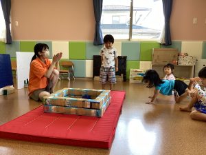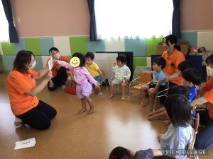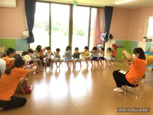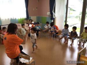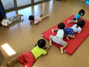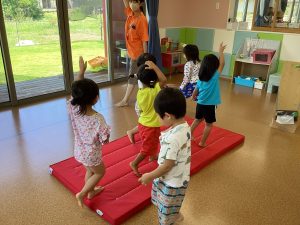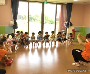 りんご組さんはこの日、水遊びの前に体操のカリキュラムをしました😊
