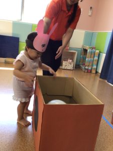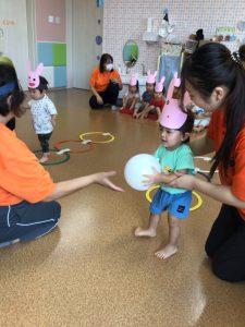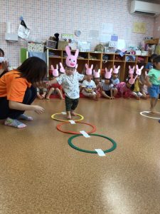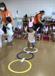 最初はうさぎさんになりきり、ジャンプをしてフープを渡ります❣️