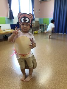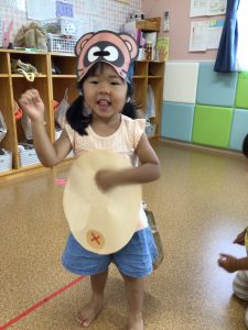 「ぽんぽこぽんっ」とリズムに乗りながらお腹を“ポンポン”と叩いたり、両手をグーにして頭に乗せてたぬきさんになってみたりと、たぬきさんと一緒に楽しく歌うことができました🎵