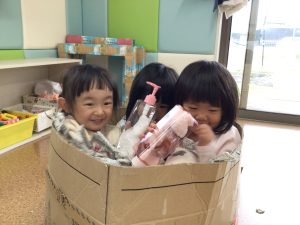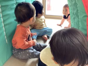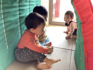 「〇〇ちゃんどこかな?」と声をかけると「ここだよー!」と自分から顔を出す可愛らしい子どもたちです😍