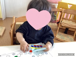 保育者と一緒にキャンディの丸い部分に貼ってみましたよ✨