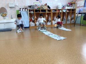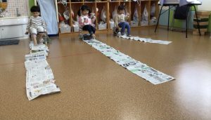 「よーいどん!」の合図で足を動かして新聞紙を引き寄せます😆
