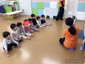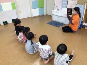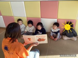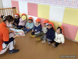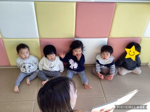 「にこちゃんの絵本読むよ!」と声をかけると、大好きなにこちゃんに大喜びのいちご組さん💓